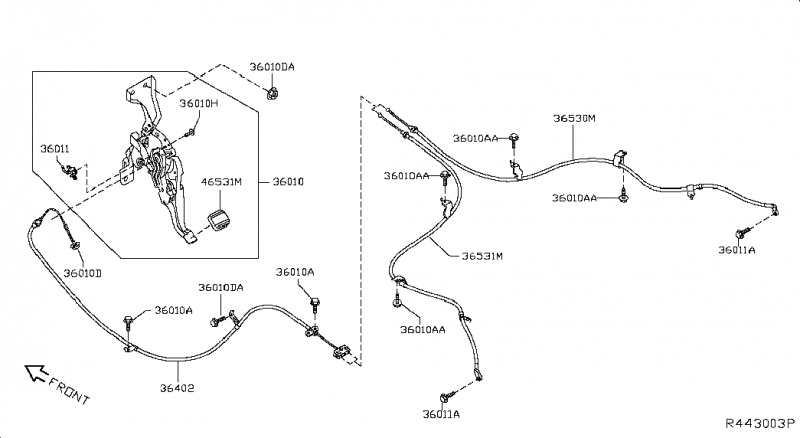 Тросик стояночного тормоза передний Nissan Rogue AWD QR25DE 2014- 364024BA0A |